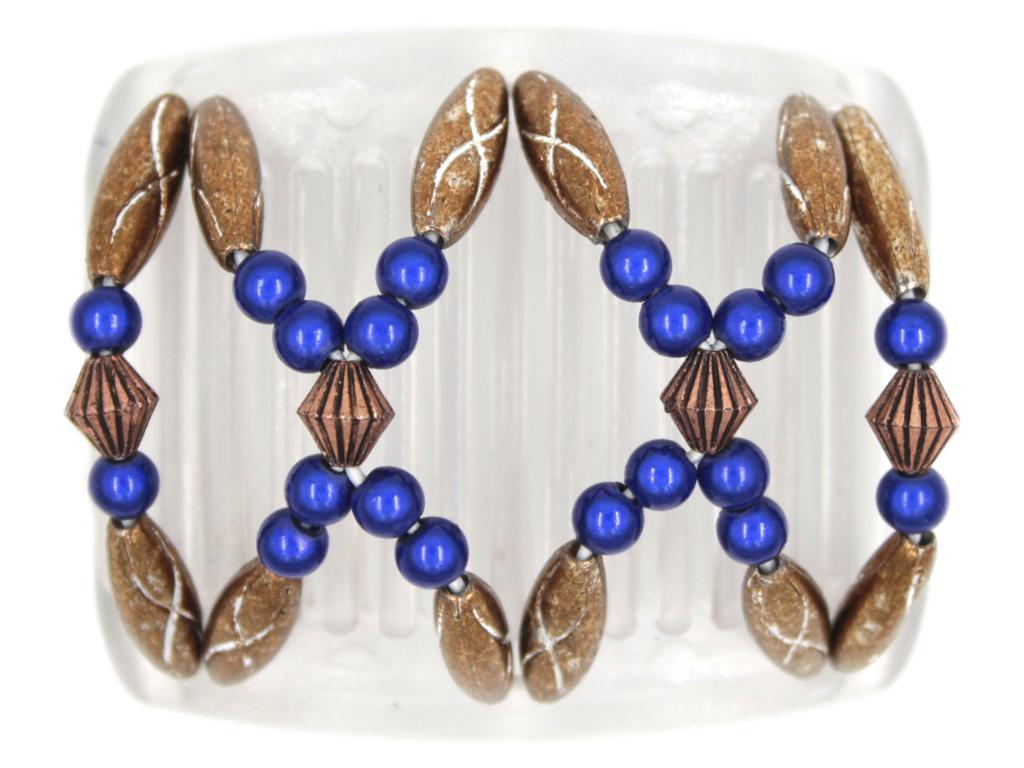 This clear Chameleon Dalena Hair Comb has what we call magic (or miracle) beads. These particular beads glow in the sun and reflect light. These beads truly are magical! This Chameleon Dalena features royal blue magic beads. Also featured in this hair comb are copper bicone beads in the center and rustic copper and silver etched oblong beads that finish out the edges of the comb. Note: Bead color may have a slight variation from those displayed due to different devices.