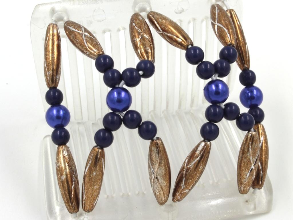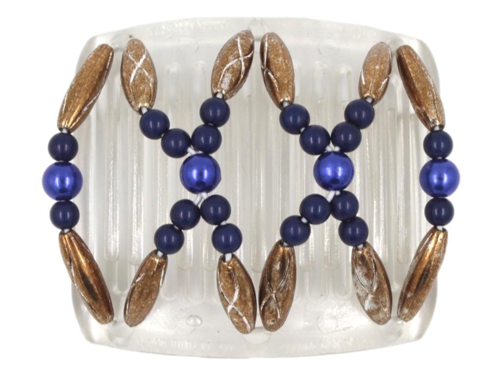 This African Butterfly Chameleon Hair Comb - Dalena Clear 24 features a unique pairing of royal blue and midnight blue beads and rustic copper beads on its edges, showcasing a stunning blend of colors. The addition of rustic copper beads lends a natural and earthy touch to the comb, making it an ideal choice for casual events. Perfect for thin or fine hair, this hair comb will effortlessly glide through your locks, providing hassle-free styling while adding a touch of elegance.