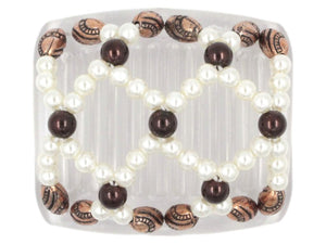 This clear Chameleon Ndalena Hair Comb features white pearl beads and wine colored accent pearl beads. Copper with black etched beads finished the edges of the hair comb. Note: Bead color may have a slight variation from those displayed due to different devices.