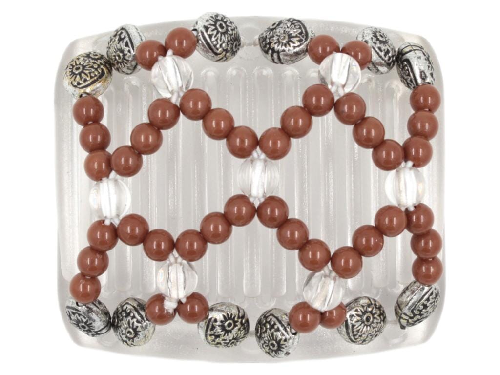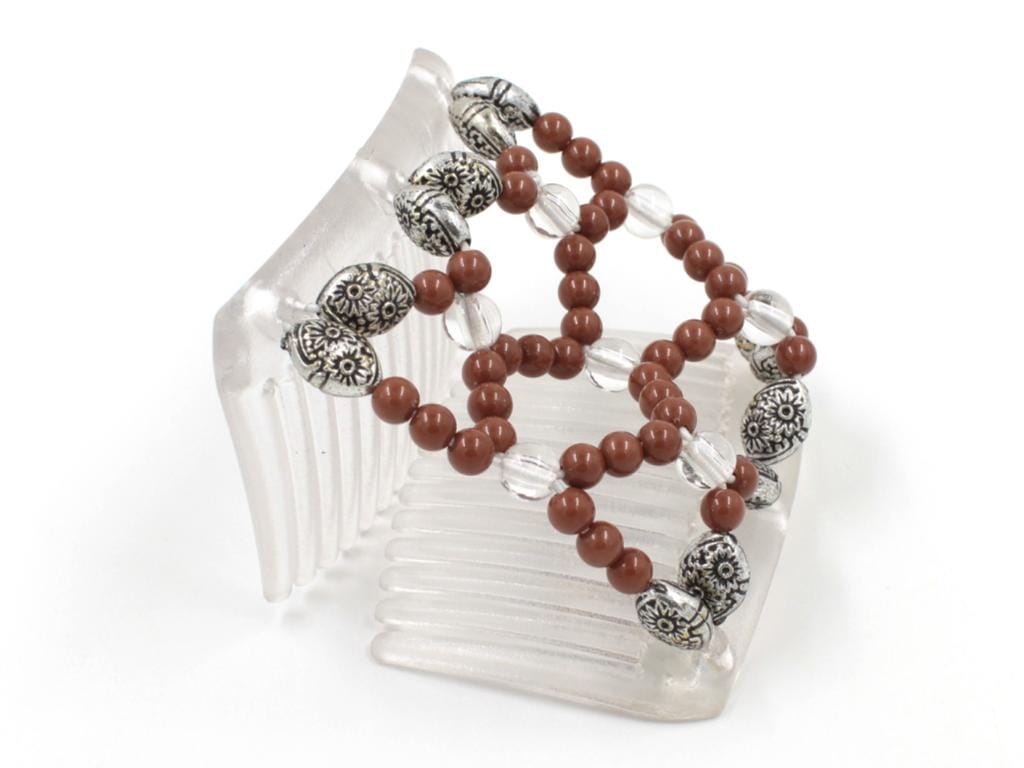 This Chameleon Ndalena Clear Hair Comb is designed with clear accent beads, cocoa beads which offer an earthy contrast, and silver etched sunflower beads on the edges.