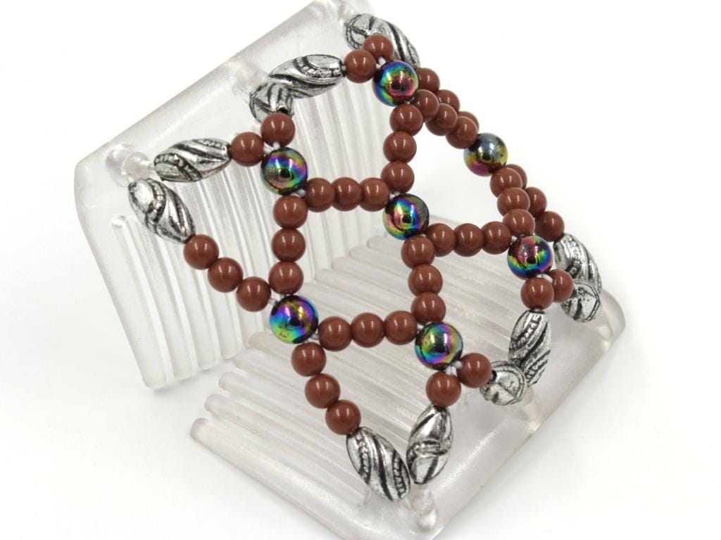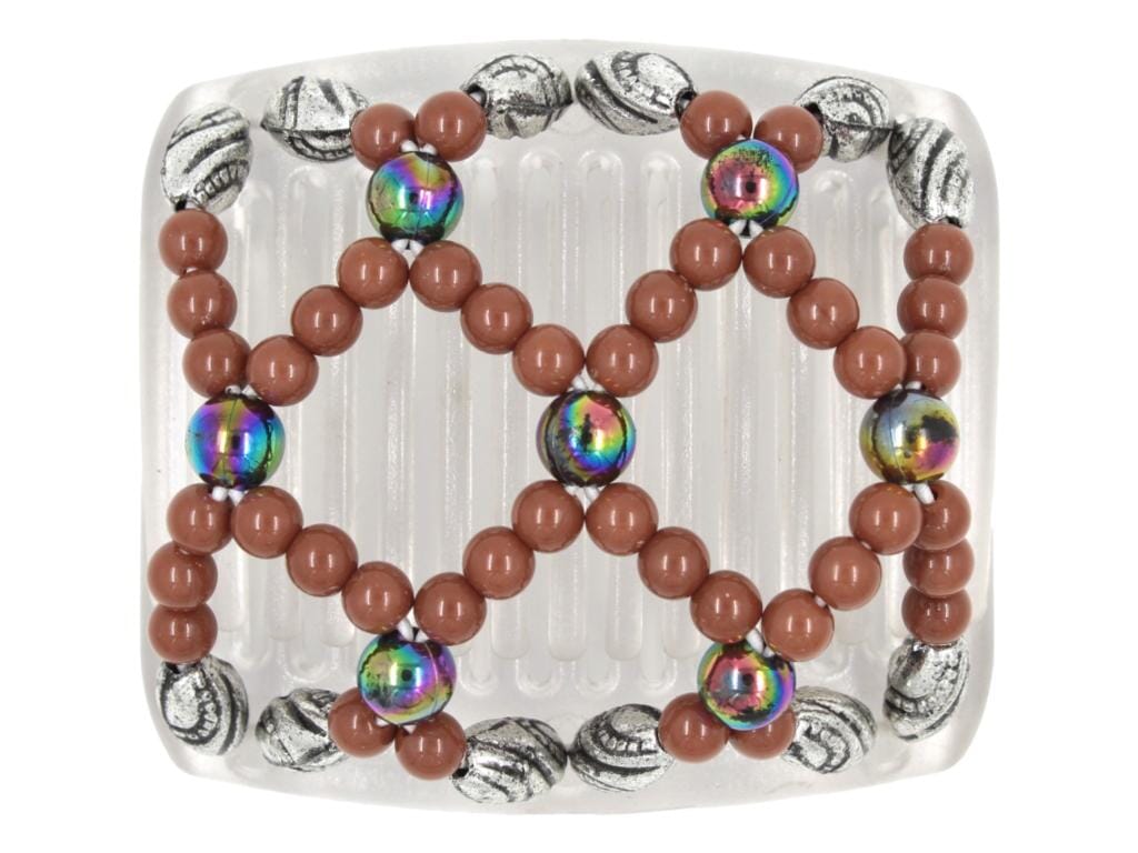 Elevate your style with this vibrant African Butterfly Chameleon Hair Comb - Ndalena Clear 27. This eye-catching piece showcases a colorful medley of popular rainbow beads, perfectly balanced by rich milk chocolate beads. Adding a touch of sophisticated edge, silver beads with intricate black etchings adorn the sides of the comb, creating a look that's both playful and refined.