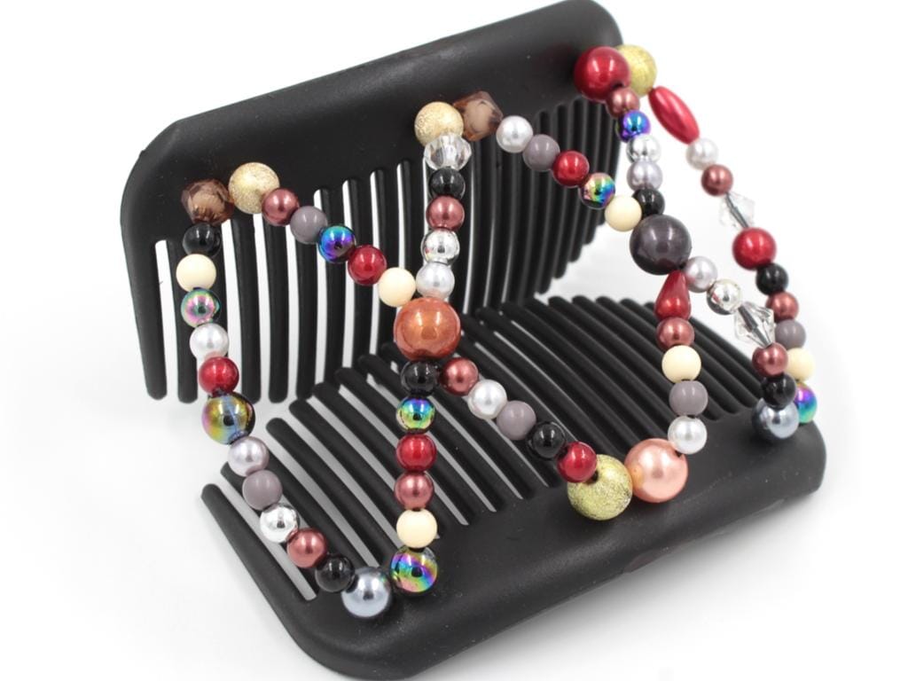 Add a playful touch to your hairstyle with this Dalena Black Hair Comb, featuring a vibrant and eclectic mix of beads. This fun and lively comb showcases a colorful medley of red, orange, gold, gray, white, and rainbow beads, creating a unique and eye-catching accessory. Perfect for those who love to express themselves through fashion, this hair comb is a versatile and whimsical addition to any hairstyle. Whether you're looking to add a pop of color to your everyday look or make a statement at a special occasion, this hair comb is sure to delight. Its fun design will ensure a smile to your face every time you wear it.
