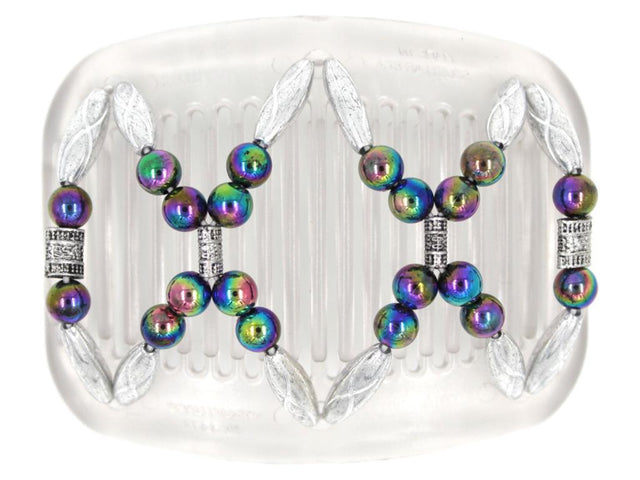 This clear Dalena Hair Comb features silver center focal beads and our popular rainbow beads. Silver etched beads finish the edges of this stunning hair comb. Note: Bead color may have a slight variation from those displayed due to different devices.