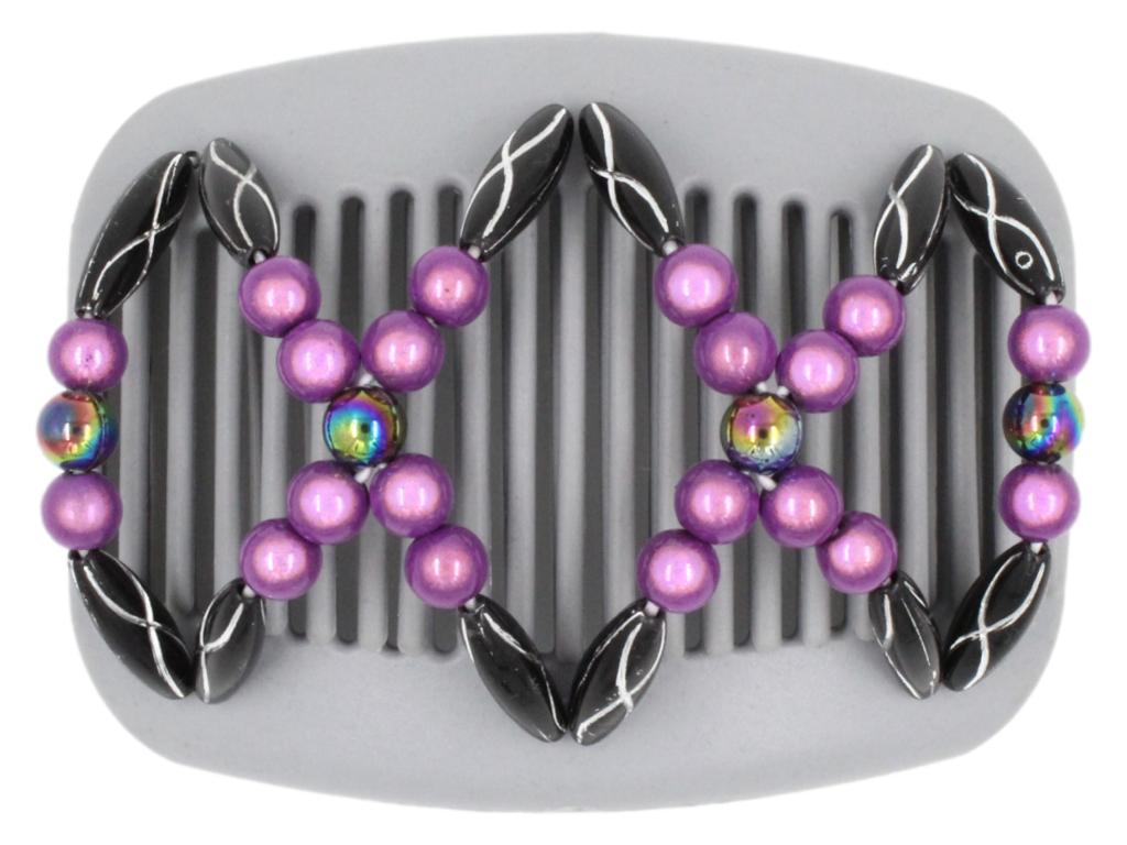 This gray Dalena Hair Comb has what we call magic (or miracle) beads. These particular beads glow in the sun and reflect light. They truly are magical! This Dalena features mauve magic beads. Also included in this comb are our popular rainbow beads and black with silver etched oblong beads finishing the edges. Note: Bead color may have a slight variation from those displayed due to different devices.
