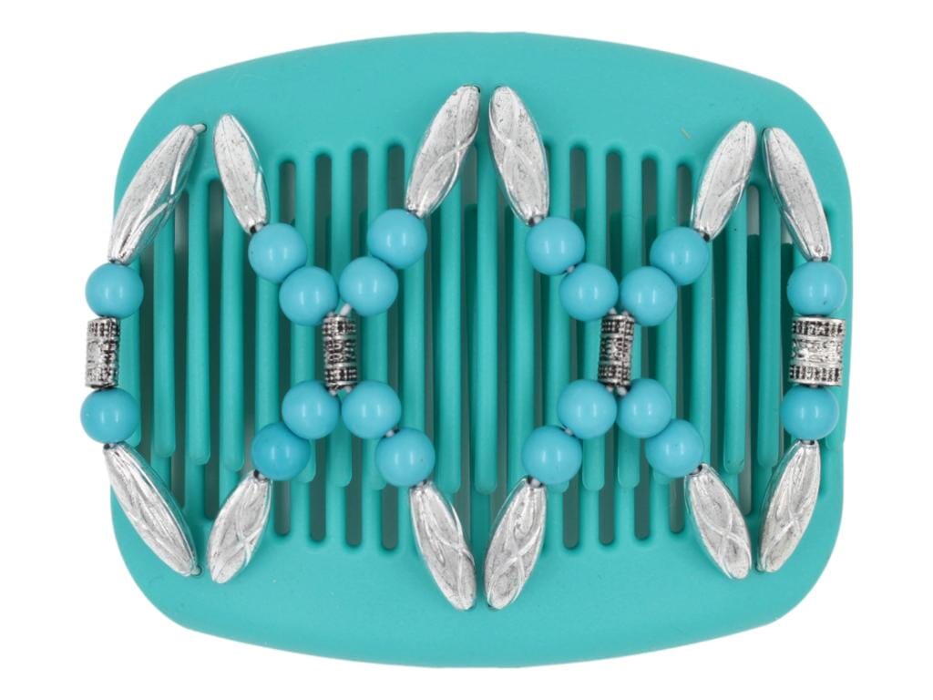 This African Butterfly Dalena Turquoise Hair Comb features a stunning combination of silver and black center beads, baby blue beads, and silver beads along the outside edges. The elegant design adds a touch of style and sophistication to your hair, making it the perfect hair accessory for any occasion. With a sleek and versatile look, it's a must-have for achieving a flawless hairstyle every time.
