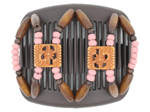 This Dupla Brown Hair Comb features light brown square acrylic tribal focal beads, dark chocolate brown wood beads, and dusty rose accent wood beads. Note: Bead color may have a slight variation from those displayed due to different devices.