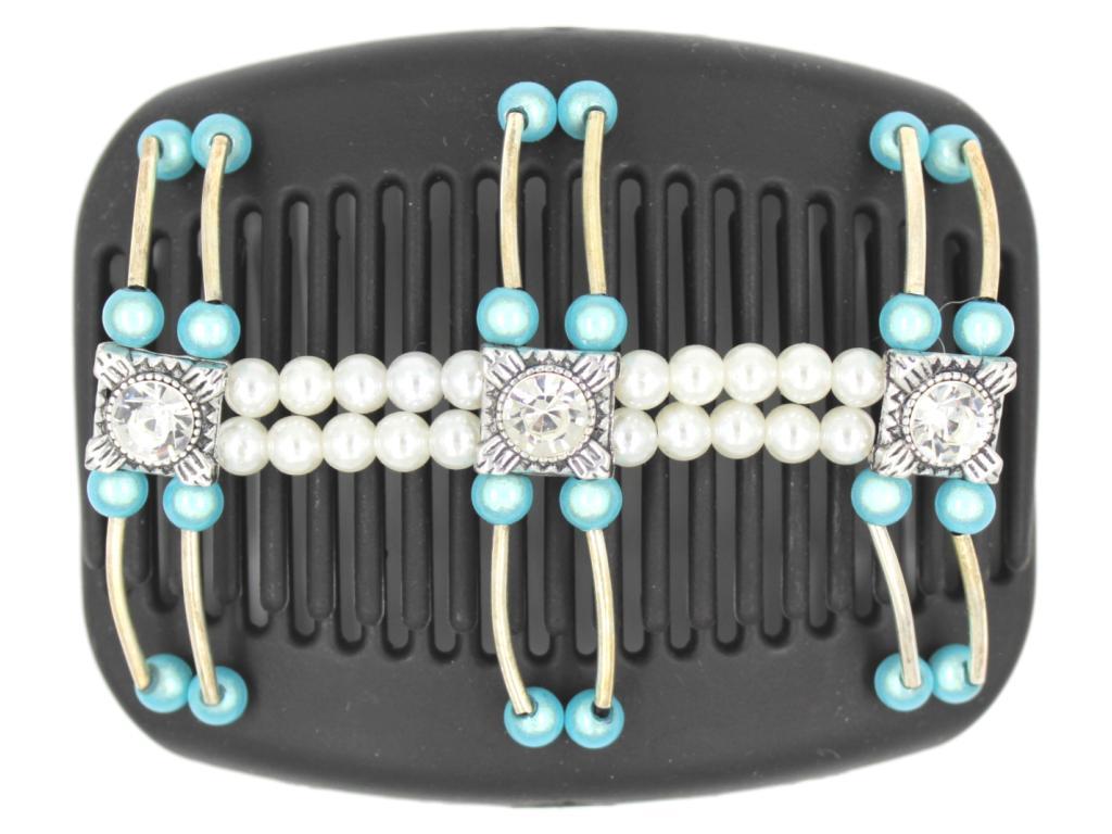 This black Flowers Hair Comb has what we call magic (or miracle) beads. These particular beads glow in the sun and reflect light. They truly are magical! This comb features baby blue magic beads. This comb also has square silver center charms with large, clear rhinestones; white pearl beads; and silver tubes. This is one gorgeous hair comb! Note: Bead color may have a slight variation from those displayed due to different devices.