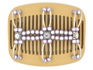 This Flowers blonde comb has what we call magic (or miracle) beads." These particular beads glow in the sun and reflect light. These beads truly are magical! This comb has thistle magic beads and center clear rhinestone charms. Silver tubes finish this delicate and lovely hair comb.