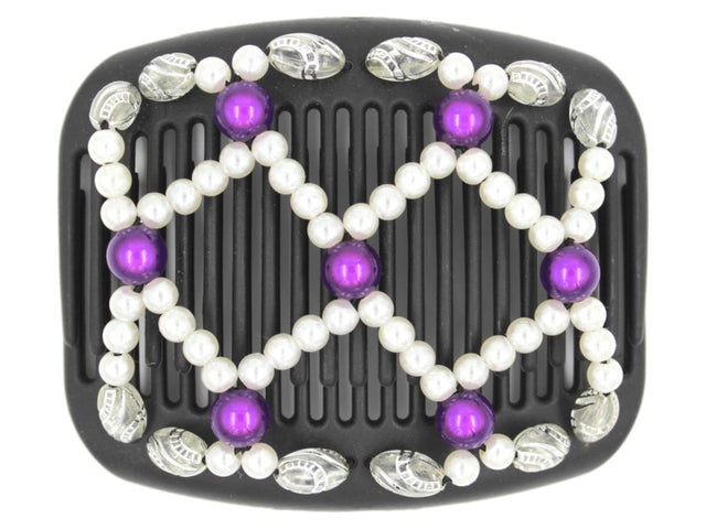 This black Ndalena Hair Comb has what we call magic (or miracle) beads. These particular beads glow in the sun and reflect light. They truly are magical! This particular hair comb features violet magic beads. This hair comb also includes white pearl beads and clear with silver etched beads along the edges of the comb. Note: Bead color may have a slight variation from those displayed due to different devices.