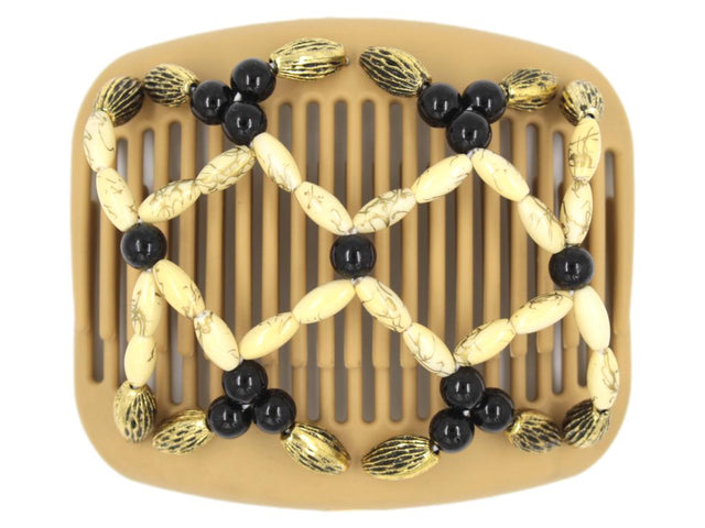 This Ndalena Blonde Hair Comb boasts an array of banana with gold swirl beads. Solid black bead accents provide a striking contrast, while the gold with black etched beads along the edges add an exotic flair that's both unique and captivating.
