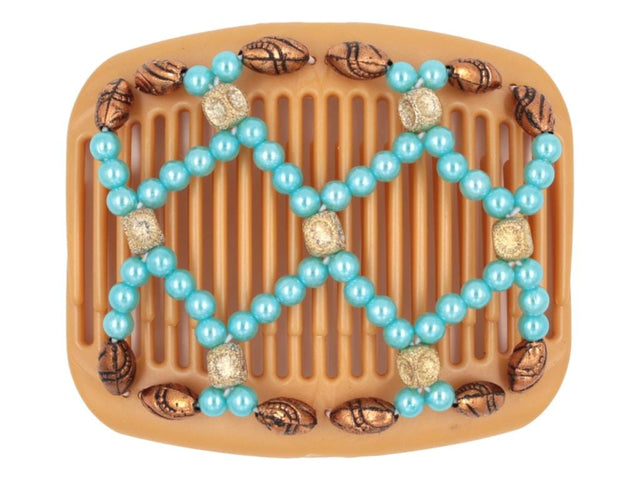 This Blonde Pearl Ndalena African Butterfly Hair Comb combines timeless elegance with playful charm. Soft baby blue pearl beads and gold shimmer accent beads evoke a romantic sparkle, while copper with black etched beads along the edges add a touch of warm sophistication. Designed for regular to fine or thin hair, this exquisite hair comb adds a delicate, eye-catching flourish to any style.