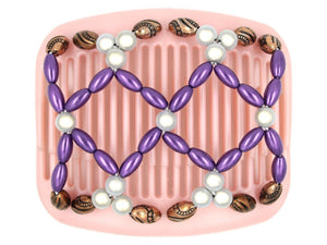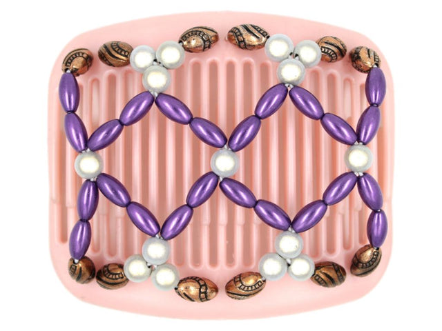 This Ndalena Pink Pearl Hair Comb has what we call magic (or miracle) beads. These particular beads glow in the sun and reflect light. They truly are magical! This particular Ndalena hair comb features faint gray/silver magic beads. Also featured in this hair comb are iris beads and copper with black etched beads along the edges of the comb. Note: Bead color may have a slight variation from those displayed due to different devices.