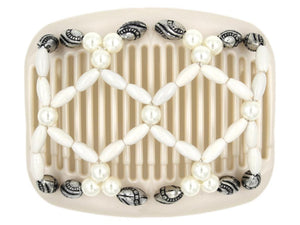 This Ndalena White Pearl Hair Comb features snow white beads, white pearl accent beads, and silver with black etched beads along the sides of the comb. This simple, yet elegant, hair comb would be beautiful for a bride. Note: Bead color may have a slight variation from those displayed due to different devices.