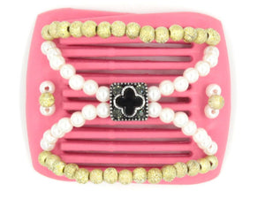 This pink raspberry LadyBug hair clip features white pearl beads, gold shimmer beads, and a black center charm.