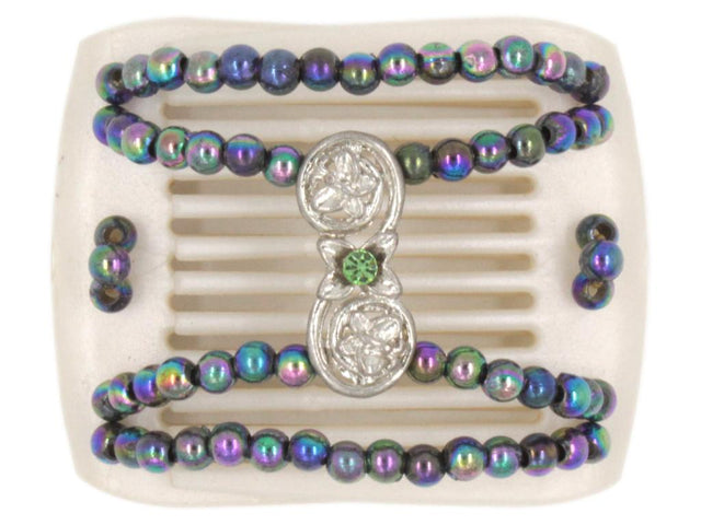 This little white pearl LadyBug hair comb features a center silver charm which features tiny butterflies and a peridot Swarovski crystal in the center. Our popular rainbow beads cover this cute little hair clip. Note: Bead color may have a slight variation from those displayed due to different devices.