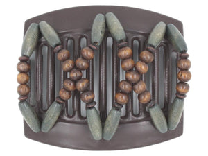 This brown Beada Thick Hair Comb features medium-dark brown wood beads and rustic green wood beads along the edges of the comb.