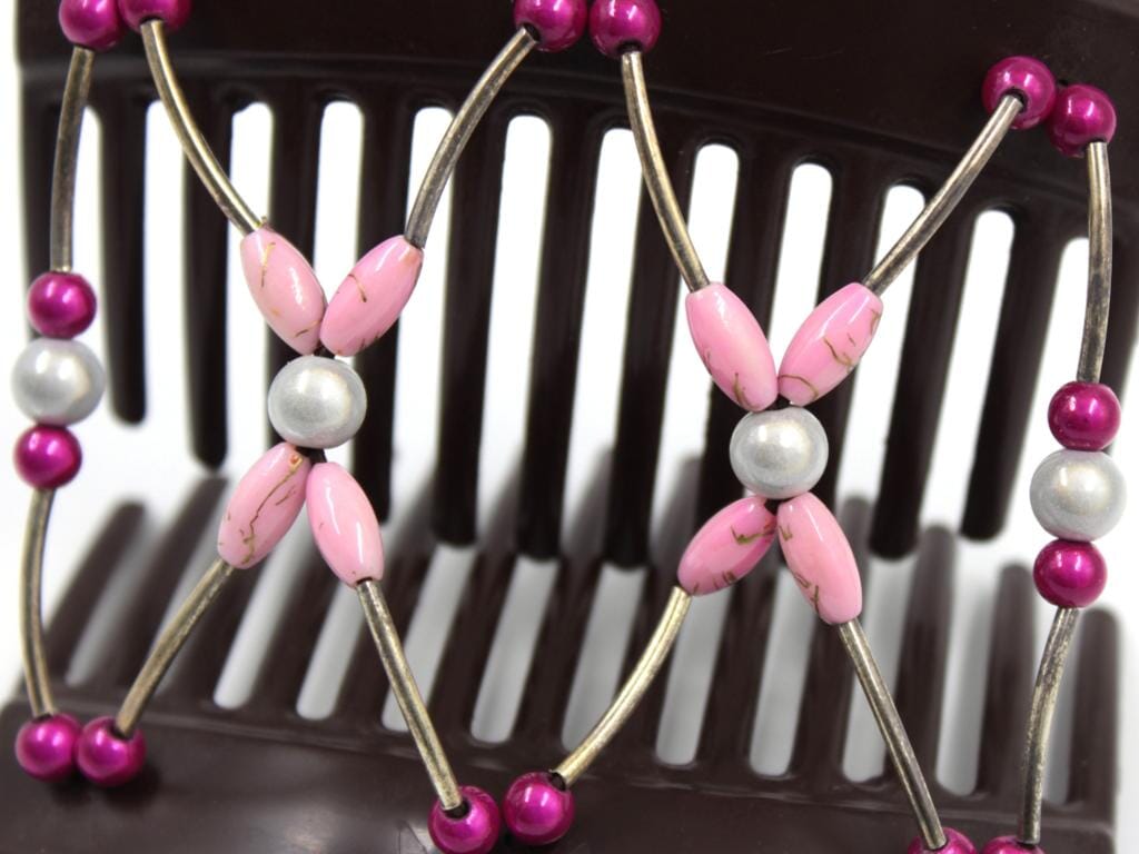 This brown Beada Tube Thick Hair Comb is a vibrant masterpiece, featuring white magic beads at its center that add a touch of purity and elegance. The pink with gold swirl beads add a luxurious and playful flair, while the silver tubes provide a sleek, modern contrast. Accentuating the edges are fuchsia magic beads, injecting a pop of color and energy into the design. Perfect for those who love bold, eye-catching accessories, this unique hair comb is sure to make a statement and add a touch of personality to any hairstyle.