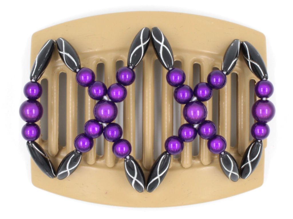 This comb has what we call magic (or miracle) beads. These particular beads glow in the sun and reflect light. They truly are magical! This particular Dalena blonde comb has grape colored magic beads. Black with silver oblong beads finish off the edges of this clip. Note: Bead color may have a slight variation from those displayed due to different devices.