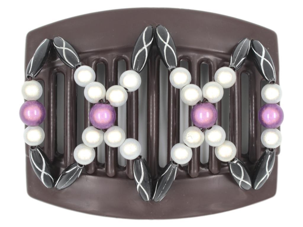 This brown Dalena Thick Hair Comb has what we call magic (or miracle) beads. These particular beads glow in the sun and reflect light. They truly are magical! This Dalena features very faint light gray/silver, which glow white in the sun, and mauve magic beads. This beautiful comb also features black with silver etched beads along the edges of the hair comb. Note: Bead color may have a slight variation from those displayed due to different devices.