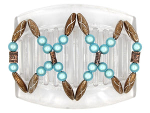 Introducing this Clear Dalena Thick Hair Comb, adorned with our signature 'miracle beads' that radiate a mesmerizing glow in the sun and reflect light, adding a touch of magic to your hairstyle. This enchanting hair comb features aqua colored magic beads that shimmer and shine, complemented by copper center focal beads that add a warm, luxurious touch. The rustic copper oblong beads along the edges add a charming, bohemian flair, making this comb a true masterpiece. With its clear base and stunning beadwork, this comb is a must-have accessory for anyone looking to add a little magic to their day!