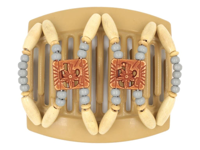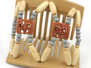 Tame your luscious locks with a touch of elegance with this Dupla Blonde Thick Hair Comb, designed specifically for thick or curly hair. Each comb is a unique work of art, featuring a harmonious blend of sierra brown square acrylic tribal focal beads, complemented by the serene tones of light gray and natural cream wood beads. This distinctive piece is not only functional but also a statement accessory that adds a refined ethnic charm to your daily hair routine.