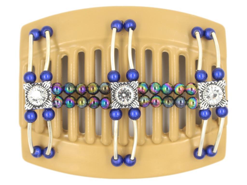 This Flowers Blonde Thick Hair Comb has what we call magic (or miracle) beads. These particular beads glow in the sun and reflect light. These beads truly are magical! This comb has royal blue magic beads. Center clear rhinestone charms, silver tubes, and our popular rainbow beads are also included in this hair comb. Note: Bead color may have a slight variation from those displayed due to different devices.