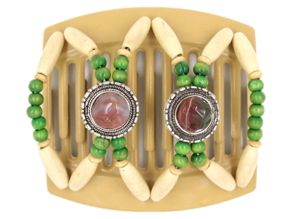 Our Gemstone combs feature tumbled and polished natural center stones. This Gemstone Blonde Thick Hair Comb features caramel and emerald colored center stones. Green grass accent wood beads and cream woods finish this gorgeous hair comb. Note: Bead color may have a slight variation from those displayed due to different devices.
