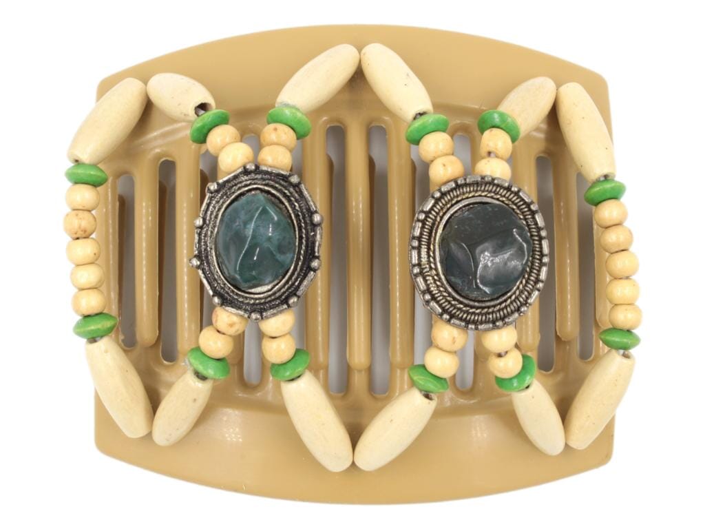This stylish Gemstone Blonde Thick Hair Comb features polished emerald green gemstones on silver conchos. Such a unique design with green grass and cream wood beads, adding a touch of elegance to your hair styling routine. The beads are securely attached to the hair comb, ensuring durability and long-lasting use. Perfect for adding a pop of color to your hair accessories collection, this comb is both functional and fashionable. Ideal for everyday use or special occasions, this comb is a must-have for anyone looking to elevate their hairstyle effortlessly.