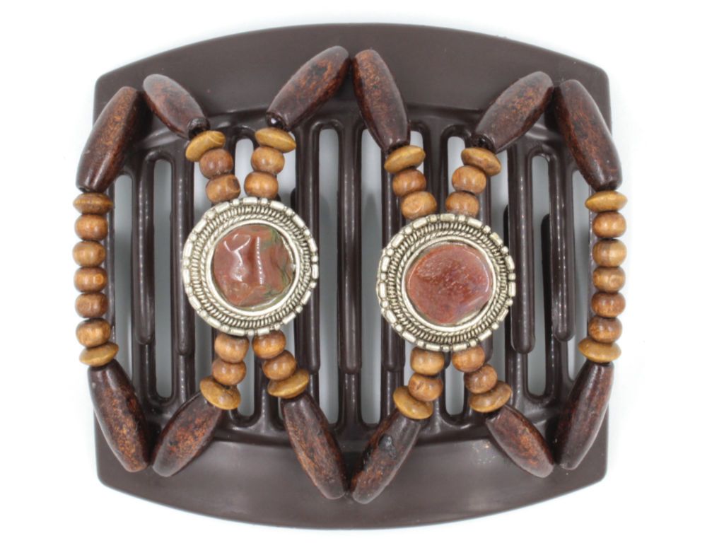 Our Gemstone combs feature tumbled and polished natural center stones. This particular Gemstone Brown Thick Comb has caramel colored gemstones, as well as natural brown woods.