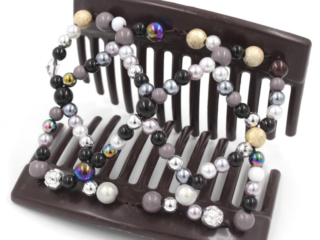 Unleash the fierce beauty of the storm with this dramatic brown Ndalena Thick Hair Comb, featuring a turbulent mix of beads in shades of grays, blacks, and white pearls. Like a tempest brewing, this thick hair comb harnesses the power of contrasting hues to create a mesmerizing effect. Dark beads evoke the mystery of the night sky, while gray and white pearls swirl together like the turmoil of a stormy sea. A true showstopper, this comb adds a touch of wild elegance to your hairstyle.