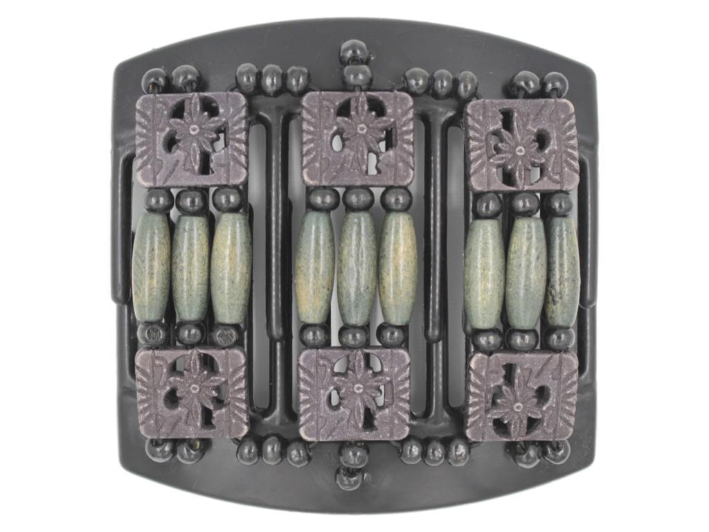 This Tripla Black Thick Hair Comb features soft black square acrylic tribal focal beads, green denim wood accent beads and black wood beads. Note: Bead color may have a slight variation from those displayed due to different devices.