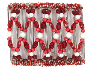 This 11 Tong Wire Hair Clip features small and large white pearls, red wood beads, and lots of dark red translucent acrylic beads. Yummy candy cane seed beads are sprinkled on the edges of the hair clip. What a perfect hair clip for Christmas or Valentine's Day!