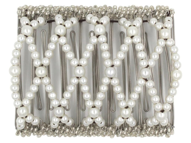 This 11 Tong Wire Hair Clip features all white pearl beads. This hair clip is an excellent choice for brides on that special wedding day! This is one of our more popular combs due to its simplicity. Note: Bead color may have a slight variation from those displayed due to different devices.