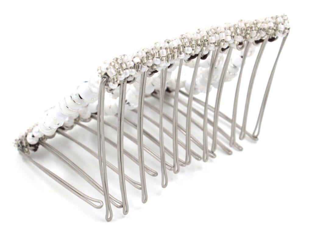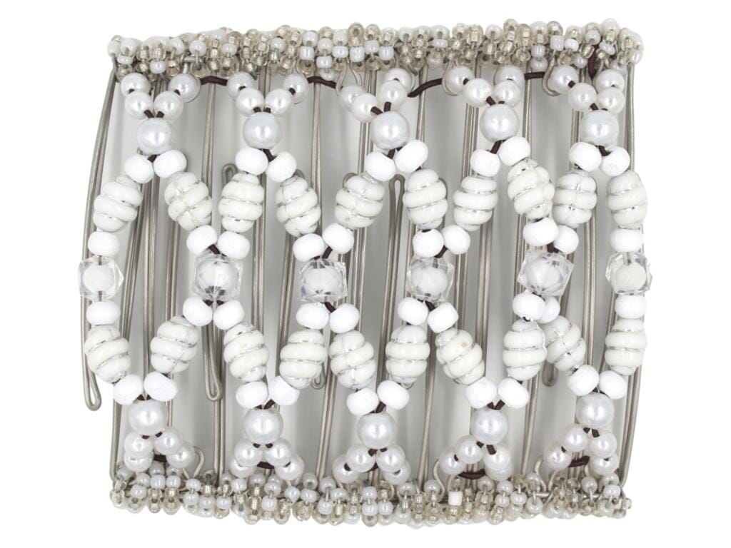 Adorn your bridal style with this African Butterfly 11 Tong Wire Hair Clip. This exquisite accessory features clear and white translucent acrylic beads in the center, framed by white and silver etched beads, painted white wood beads, punctuated with luminous white pearly beads. Elegant and sophisticated, this hair clip is the perfect accent for your special wedding day. Note: Bead color may have a slight variation from those displayed due to different devices.