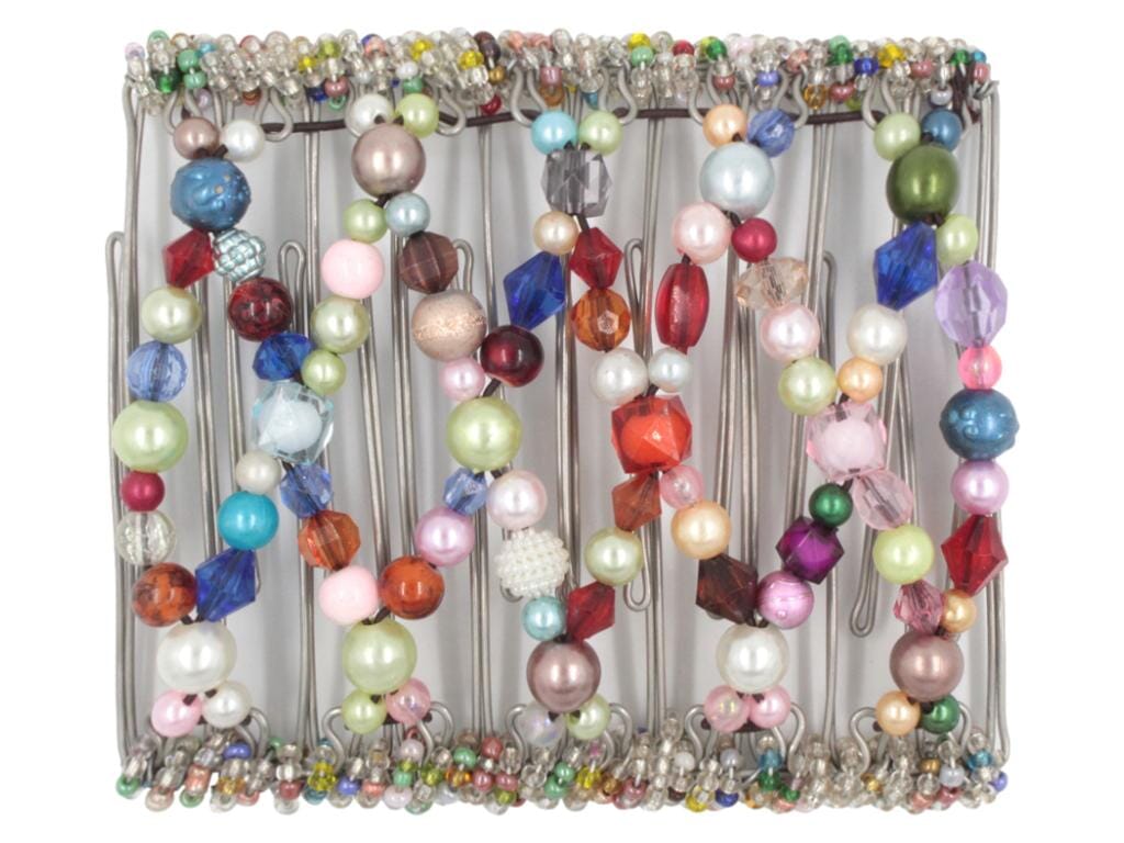 This hair clip features different types, shapes, and colors of beads, making it truly one-of-a-kind. The beads are securely attached with industrial strength elastic, so your hair gets maximum hold. With its bright and vibrant colors, this piece shines when worn and is sure to turn heads. Plus, it's easy to use so you can style your hair in no time.