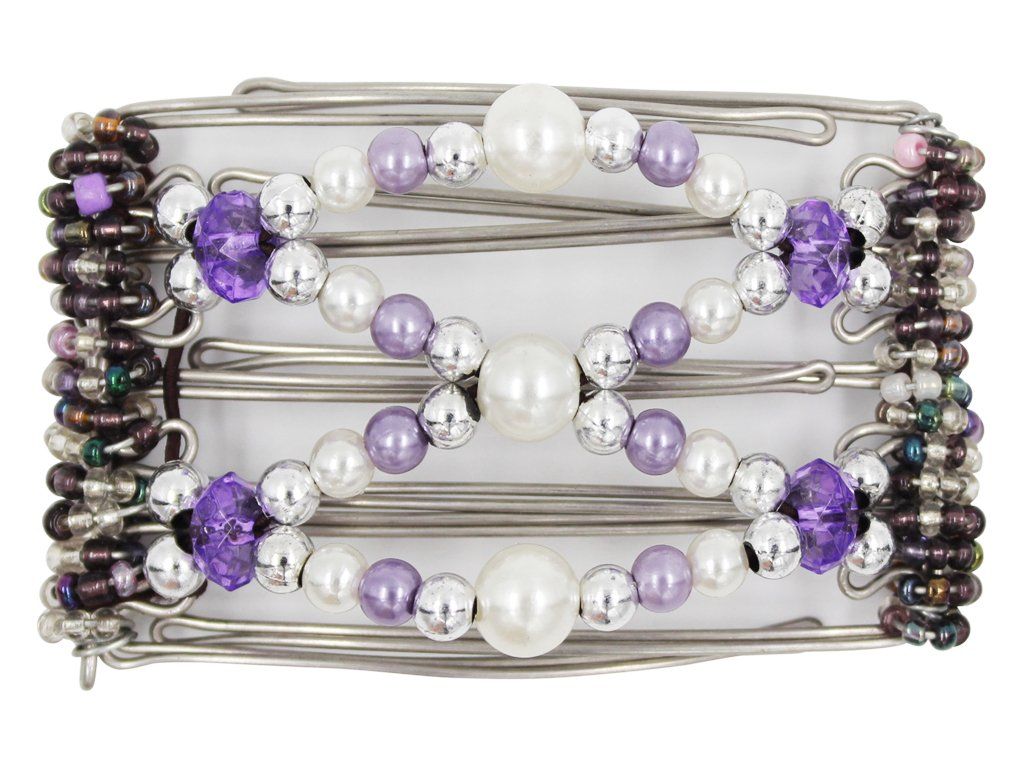 This 5 Tong Wire Hair Clip features large white pearls in the center of the clip. Shiny silver beads, heather pearl beads, and lilac acrylic beads are also featured in this pretty hair clip. Note: Bead color may have a slight variation from those displayed due to different devices.