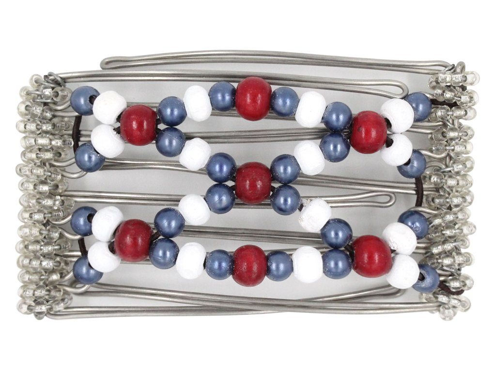 This rustic 5 Tong Wire Hair Clip displays America's symbolic colors to celebrate our great country. Wearing this hair clip is one small way to show your patriotism and pay tribute to the men and women who have given their lives while serving in our nation's armed forces. Note: Bead color may have a slight variation from those displayed due to different devices.