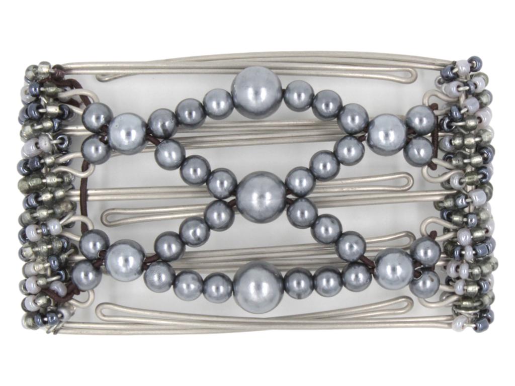This 5 Tong Wire Hair Clip features two shades of gorgeous gunmetal gray pearly beads. This hair clip would be stunning in black, gray, or white hair and be quite lovely for a night event! Note: Bead color may have a slight variation from those displayed due to different devices.