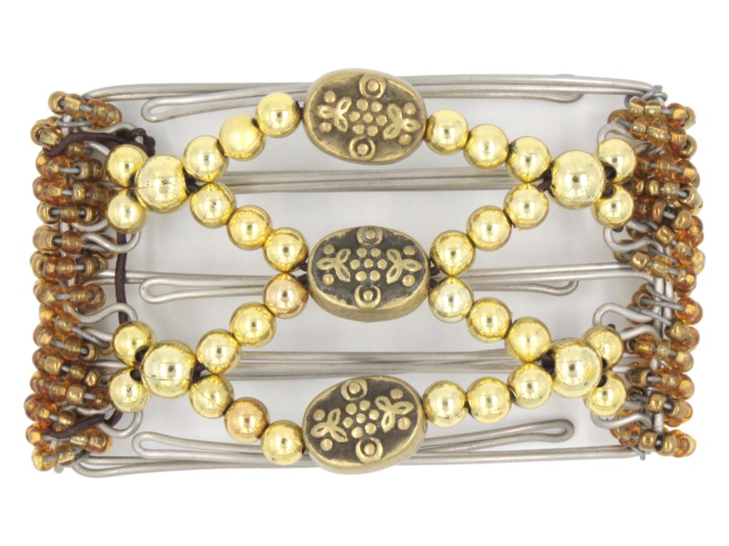 This 5 Tong Wire Hair Clip features puffy antique brass center beads, as well as lots of sparkling gold beads.