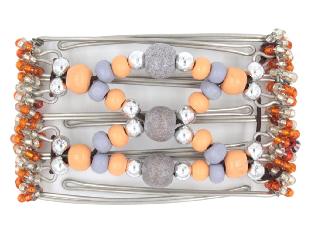 This 5 Tong Wire Hair Clip features faux taupe stone center beads, apricot and blue/purple wood beads, as well as silver beads. Note: Bead color may have a slight variation from those displayed due to different devices.