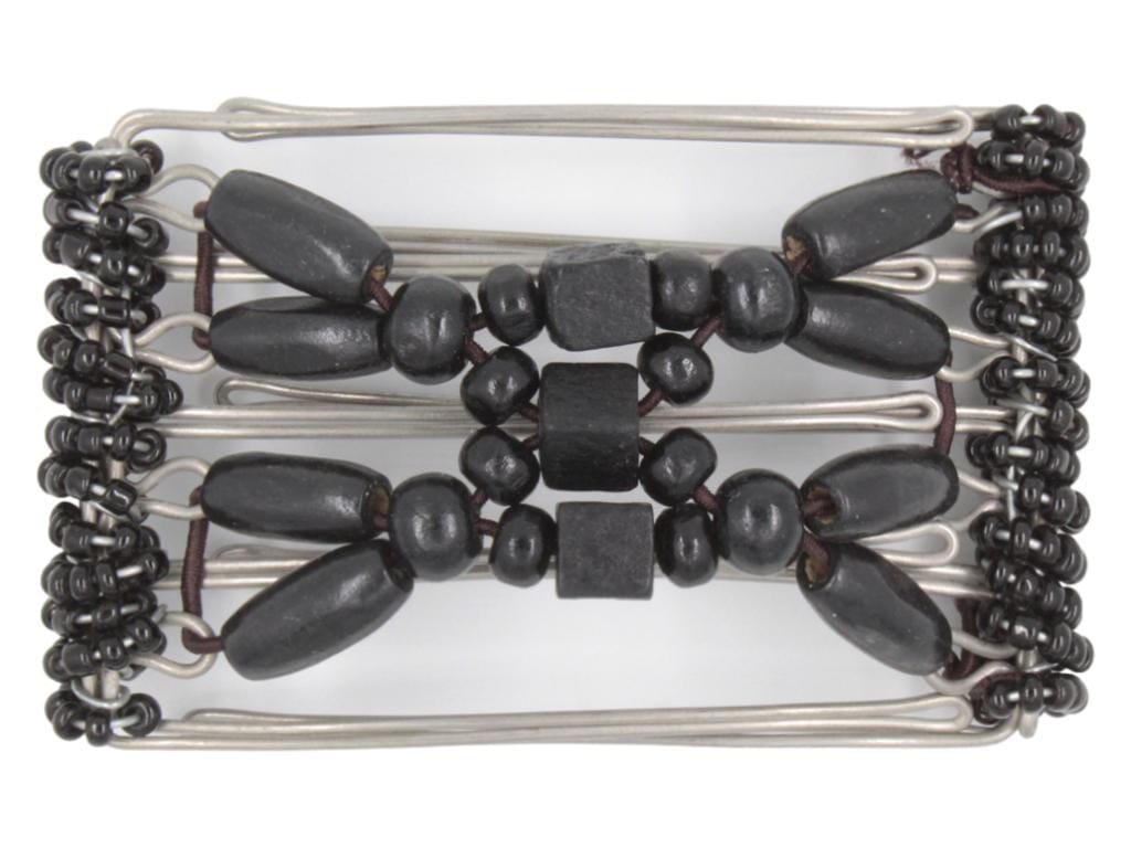 This 5 Tong Wire Hair Clip features differently shaped solid black wood beads. This clip would be perfect for a prom or formal event. It is a very stunning hair clip! Note: Bead color may have a slight variation from those displayed due to different devices.