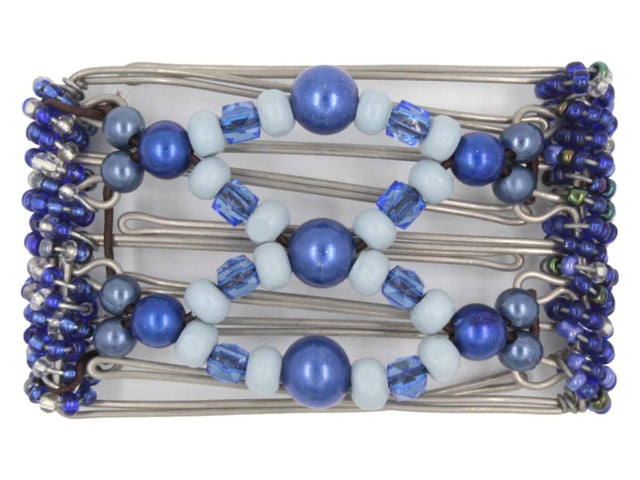 This 5 Tong Wire Hair Clip features all shades of blue - midnight, royal, sapphire, and a rustic light blue. Note: Bead color may have a slight variation from those displayed due to different devices.