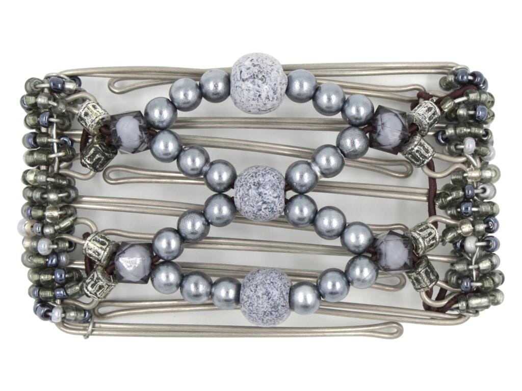 This 5 Tong Wire Hair Clip is the perfect accessory for any special evening. With stunning faux stone beads in the center and gorgeous pewter gray pearly beads, dark gray translucent acrylic beads, and silver beads along the edges, it will be the perfect addition to your look! This hair clip would look absolutely stunning in black, gray or white hair, making it a great choice for a night out. Be the talk of the town with this beautiful hair clip! Its versatility and quality are unmatched, so you can be sure it'll last you many years.