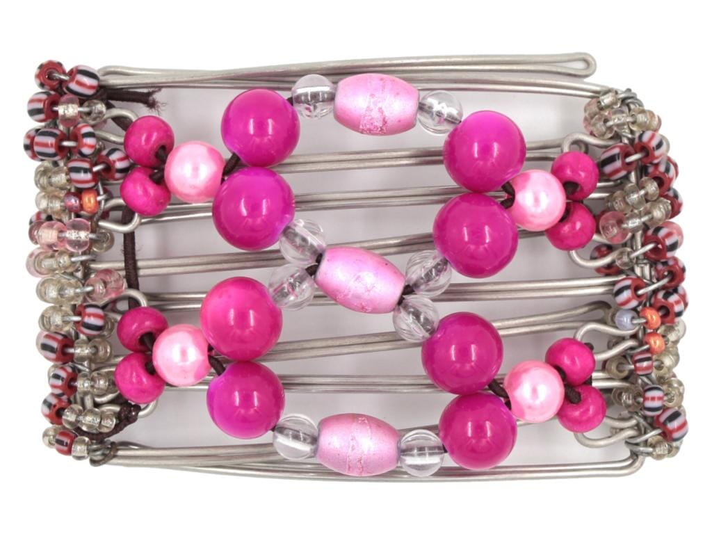 Make sure to turn heads wherever you go with this stunning 9 Tong Wire Hair Clip! With exquisite shimmer rose beads sitting proudly at the center, surrounded by clear acrylic beads, hot pink beads, pink pearly beads, and fuchsia wood beads along the edges – your look will be out of this world. With a strong grip, you can be sure that these clips won’t slip or slide out. This fabulous accessory is guaranteed to wow and is a must-have for any long-haired fashionista. Get this eye-catching hair clip now to take your look to the next level!