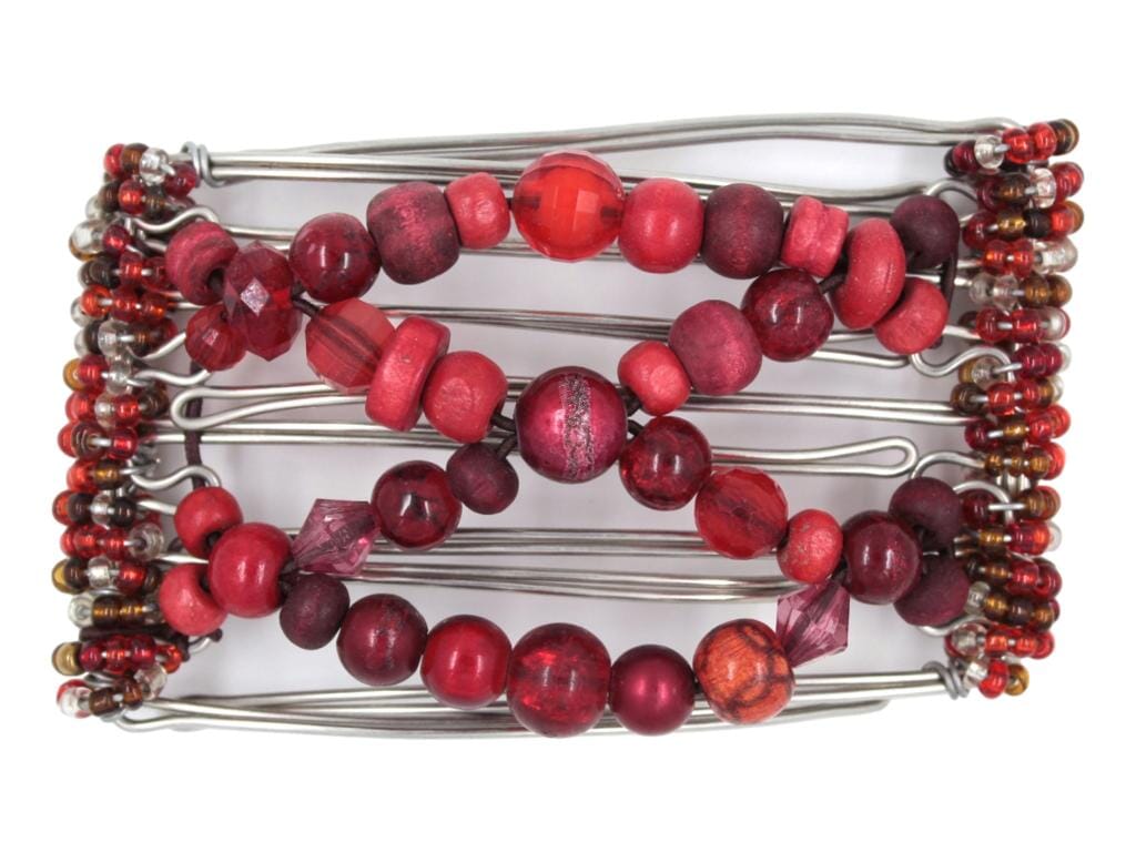 Add a touch of elegance and festive charm to your hairstyle with this beautifully handcrafted 5 Tong Wire Hair Clip. Featuring an artful mix of red shimmer beads; rich, red wood beads; and deep red acrylic beads, each element is thoughtfully combined to create a unique accessory bursting with character. Delicately sprinkled along the edges are delightful candy cane seed beads, adding a whimsical sparkle that catches the light with every movement. Measuring perfectly to secure your hair comfortably, this clip is ideal for both everyday wear and special occasions.