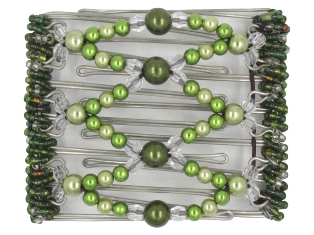 This 7 Tong Wire Hair Clip features three shades and sizes of gorgeous pearly green beads and lots of tiny clear faceted beads. Will this hair clip bring you good luck or will it be worn for a festive holiday party? Note: Bead color may have a slight variation from those displayed due to different devices.