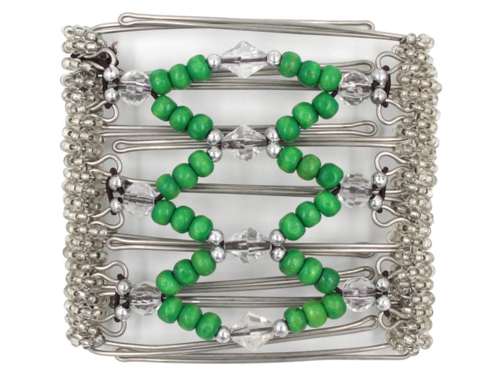 This African Butterfly Wire Hair Clip is a stylish and practical choice for anyone looking to add flair to their look. Featuring clear acrylic bicone and round beads, tiny silver beads, and green grass wood beads, this 7 Tong 422 clip is sure to make an impact.