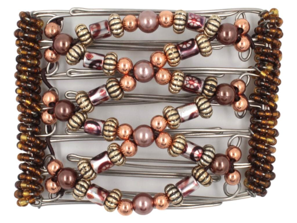 Introducing this 7 Tong Wire Hair Clip, a luxurious accessory that exudes elegance and sophistication. The pearly beads in the center are surrounded by shiny copper and boho beads, creating a stunning contrast against the mocha backdrop. The touch of gold and amber seed beads along the edges adds a sophisticated finish. This hair clip is not just an accessory, it's a statement piece that adds a touch of glamour to any hairstyle.