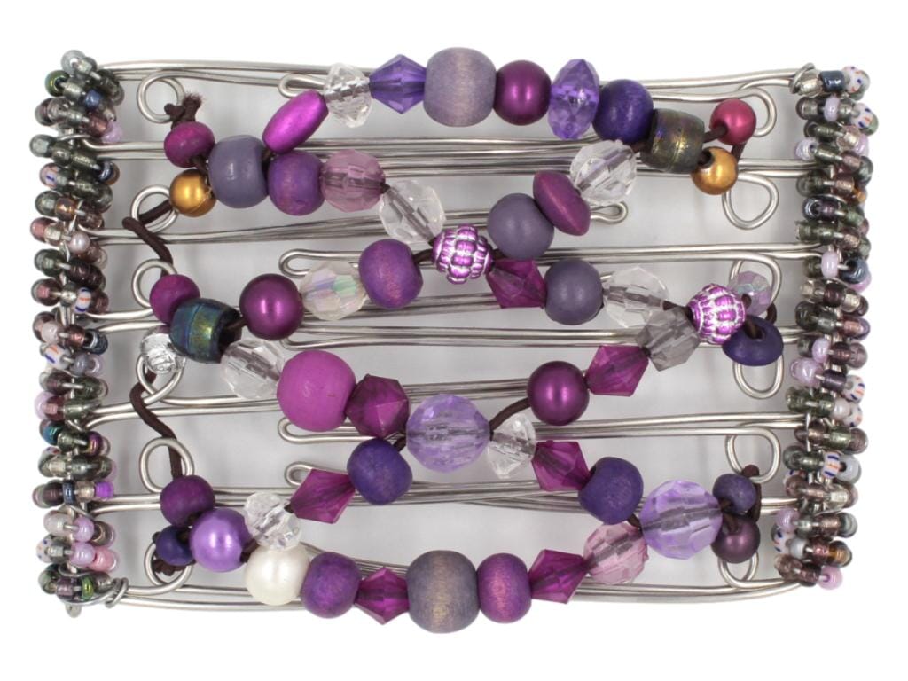 Step into a world of enchanting glamour with this 7 Tong Wire Hair Clip, a piece that is as unique as you are. This whimsical hair accessory is meticulously handcrafted, featuring a variety of shapes and textures of a beautiful array of purple shades. From the softest lavender to the deepest plum, this hair clip captures all the mystical allure of this royal color.