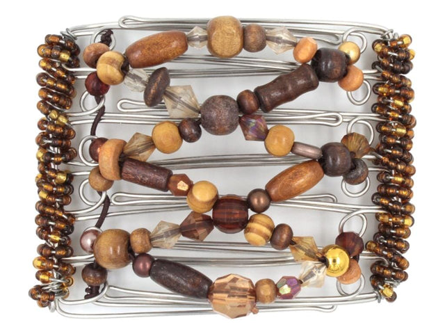 Experience the charm and uniqueness of this 7 Tong Wire Hair Clip. With its earthy tones and eclectic bead design, it's a perfect gift for the fashion-forward individual or a special treat for yourself. This hair comb features a mix of wood beads and acrylic beads. The wood beads lend an organic, natural feel to the piece, while the acrylic beads add a touch of modern elegance. The beads are arranged in a stunning pattern that showcases various shades of brown, creating a versatile hair accessory that can complement any outfit. This meticulously handcrafted hair clip is an absolute must-have for those that love to lead with style!